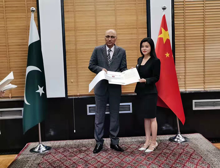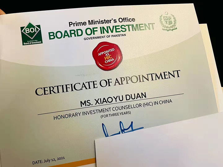 2021年9月15日,巴基斯坦駐華大使館舉行隆重的頒獎儀式,代表巴基斯坦投資委員會BOI頒發(fā)榮譽(yù)投資參贊證書。來自中巴兩國的媒體,政府官員,企業(yè)代表等80多人見證了頒獎儀式。段曉喻董事長表示“投資參贊是巴基斯坦投資委員會對我們的信任,既是一份榮譽(yù)也是沉甸甸的責(zé)任,我將致力于為中巴貿(mào)易做出應(yīng)有的貢獻(xiàn)”